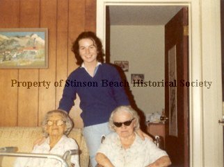 A color photograph of Agnes Bourne and Lollie Landerbe, sisters (twin?) lived behind Village Green I, across from the Parkside, with their caretaker, Kate from Ireland. The photograph appears to be taken inside the living room of their home in front of a doorway leading into a bedroom. Agnes is sitting on a yellow couch with her walker placed in front of her. Lollie in a wheelchair. Kate stands behind the two sisters. A framed painting of a local scene is on the wall behind them. Lollie is wearing a dark eyglass. Both are wearing whitish blouses. On the back, it is written in pen, "Agnes & Lollie, photo May 28, 1981, Kate from Ireland."
