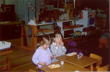 A color print from a slide of Montessori Preschool in 2001. Two children eating snack of sliced oranges. Bagley, Michaela and Fox, Linnea.