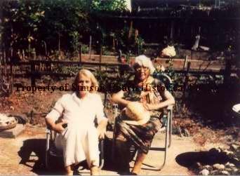 Sitting in lawn chairs in a garden are Loretta Boyd (L) and Ida "Tookie" Allen (R). The garden is mainly dirt and rock. There may be raised beds behind them as there is a long timber extending the length of the area with posts. There seems to be a house in the shadows behind them. Loretta is all in white and looking at the camera. Tookie is in a colorful print muumuu and holds a sunhat on her lap. She has short white hair and wears glasses.