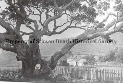 This black and white photograph shows the gnarled trunk of a huge oak tree dwarfing the figure of a woman seated upon and against its base. There is an unpainted picket fence running behind the oak and a ranch house behind that.