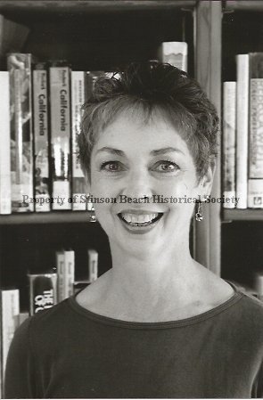 Despite suffering from multiple sclerosis Valerie Houlihan spent many active hours as library volunteer as well as digitizer for the SBHS archives. Here she poses in front of shelves of books wearing a dark boat-neck sweater with dainty drop earrings. She has dark hair worn in a pixie cut.