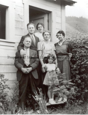 Harper family members (3 women, 2 men and one little girl) stand in a cluster outside the back door of their house in Stinson Beach. They are identified as Regina, Gus, Edward, "Babe," Ann and "Aunt Emily."