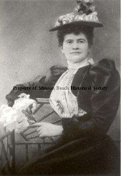Formal portrait of a woman in Victorian dress (dark satiny jacket with bouffant sleeves and high-collared floral print blouse) and flat brimmed hat with white curly stuff on top, sitting on an open-backed wooden chair with her arm resting on the top meeting the bouquet of flowers she hold in front of her in her other hand. Her body is turned slightly to one side so she is looking slightly over one shoulder. She has a hint of a smile. Her hair is worn up under her hat.