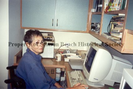 A color original photograph of Valerie Houlihan as she sits in front of SBHS computer. She was one of the SBHS digitizers. She past away a year after this photo was taken.