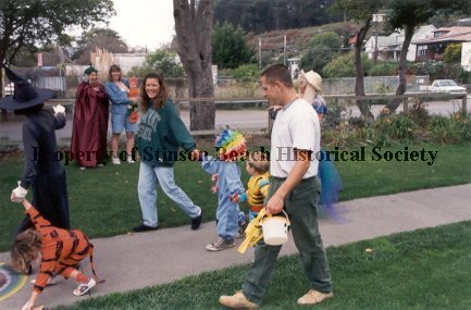 Walking on the path through VGI are parents Mary Greenway and Chris Kelly, each holding the hand of their child. Actually, everyone is holding hands as they walk together. There are other costumed people in the photo - a witch, all in black holding the hand of a child in a tiger suit who is picking something off the ground, is waving to a couple standing by the fence, one is in a costume of purple while the woman in denim holds an infant in her arms.