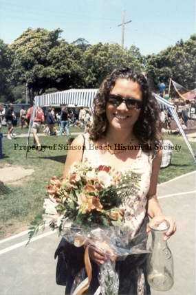 Mary Greenway stands on the court at the Village Green holding a bouquet of flowers in one hand and a glass jar in the other. She is wearing dark glasses and a white sleeveless shirt. People seem to be mingling/strolling the background. There is a blue & white striped tent umbrella set up on the grass.