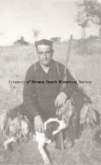 Black and white copy of a photographic print of Frenchy Gales with his hunting dog, a hunting rifle and a bag of birds. He is posed in a field with a distant vehicle on a road behind him.