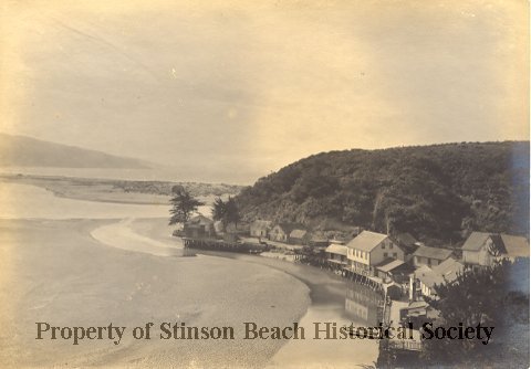 A photograph of Bolinas houses on Wharf Road along the Bolinas Lagoon by Edgar A. Cohen on 6/1/ 1904. Shows unimproved Little Mesa to right, 10 or 11 houses, boat channel, Lagoon and hills along the lagoon toward Stinson Beach. On the back: 6/1/04 - 8.20 Am. (in pencil) Photograph (stamped) #1834 Low Tide on Bolinas Bay Water Front (penciled) Edgar A. Cohen, Alameda, Cal. (stamped)