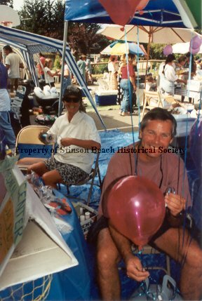 Kevin Hicks sitting on a folding chair holding a red balloon under a blue umbrella tent. A folding box shows that it is the SB Medical Center kiosk. A woman in sunglasses, white shirt and blue patterned shorts sits behind him holding ribbon. Seems like they're in process of filling balloons with helium. More of the fair is visible in the background.