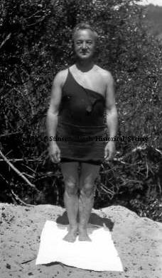 In this black and white photograph a man stands on a towel on a sand dune, facing the camera in a black bathing suit with a shoulder strap pulled off exposing his left shoulder. The man is Tiv Krelling. (See #1999-342)