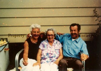 Seated on an outdoor loveseat are (L to R) Barbara Lawrence, Sarah Lawrence and Kenneth Mayers. Sarah looks to be the matriarch and she is resting one hand on the leg of Barbara, who looks quite tan and fit in a sleeveless black top and white slacks. Her hair is also a lovely shade of white and she is holding a pair of glasses in one hand while the other is stretched behind her on Ken's arm. His arm is resting on the back of the loveseat. He is wearing a blue shirt, brown slacks. Sarah has on a pastel print shirt. Her hair is gray and she is wearing glasses. The loveseat is against the wall of a house with no distinguishing characteristics.