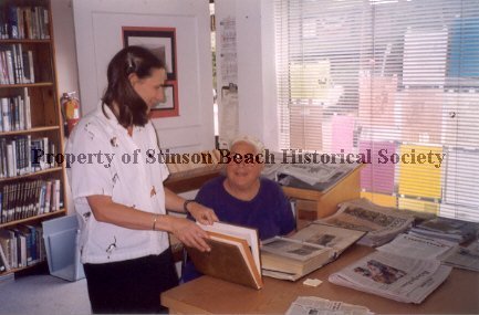 Inside the old Stinson Beach Library (at 3470 Shoreline Hwy), Librarian Kerry Livingston stands at a wooden table at which Nancy Sullivan is sitting. Kerry is looking at Nancy while opening a large book. Nancy has a large photograph album open in front of her on the table and is looking at the camera. The table is in the center of the room, The door behind them is open. The front window has open blinds through which can be seen numerous colored fliers taped to the window. There is a bookshelf against the wall by the door.