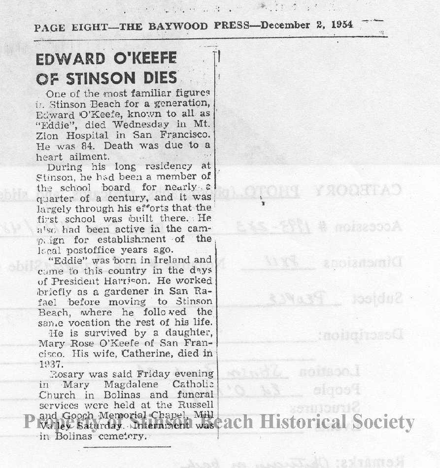 Early settler in Stinson Beach. Obituary on back of original print (see image 2). Wife Mary O'Keefe (see #1993-298).