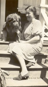 Written on the back of the original photo: The Faithful Watch Dog and Mary R. O'Keefe on her lower steps at Stinson Beach, Laurel Ave. Marin County Calif.