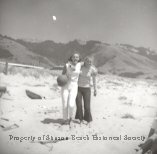 This black and white photographic print shows two girls standing on a sand dune. The one on the left is holding a large ball in her right hand and has her left arm around the shoulders of the girl on the right. The girl on the left is wearing white slacks and a white sleeveless top. The one on the right is wearing dark slacks and a lighter t-shirt. Both girls are smiling and looking at the camera.