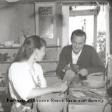 This black and white photo shows a man (Gerry Olds) and woman sitting at a worktable. He is facing the camera and she is sideways to the camera on his right (on the left side of the picture) and looking at him. He wears a white shirt under a dark cardigan sweater. She has long dark hair and wears a white blouse and print skirt. He is working with his hands but it is impossible to tell what he is doing. She is working with a mallet and chisel hollowing out what appears to be a double wooden bowl. There are tools and a bowl on the table in front of her and a window behind him.