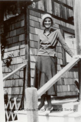 A photograph of Peggy Pepper standing on the steps of a shingled house. She is wearing a dark skirt and light blouse and a cloche hat and her left hand is on the railing.