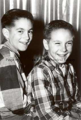 Semi-formal portrait of two smiling young boys, Charles Robinson Upton (L) and Gary Waldo Upton (R). Both are wearing plaid shirts and have slicked back hair. They are sitting in front of a curtain, sort of at an angle, with Gary more or less facing right, and Charles seated so he is looking over his shoulder at the camera.