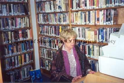A blond woman (Katherine Treffinger) sits in a corner of the library in front of a table that has what looks like a computer printer on it. She is wearing a black & white blouse under a dark patchwork print velvet-looking jacket. The shelves behind her are packed with books.