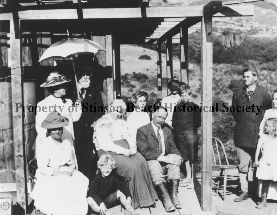 This black and white photograph was given to SBHS by Joan Reutinger. It show Dunn Family, her family with their friends in 1910 or before at Doughty House which was one of the first houses built on the hill.