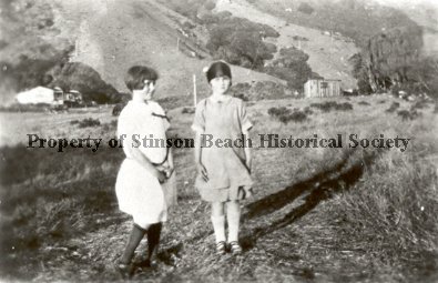 Two young girls stand in an open field, or pathway to the structures in the background, which sit at the base of the hillside. The girl on the left wears a white sailor-type dress with dark knee socks. Girl on the right is wearing a light-colored dress which just reaches her knees and white knee socks. They are unidentified.
