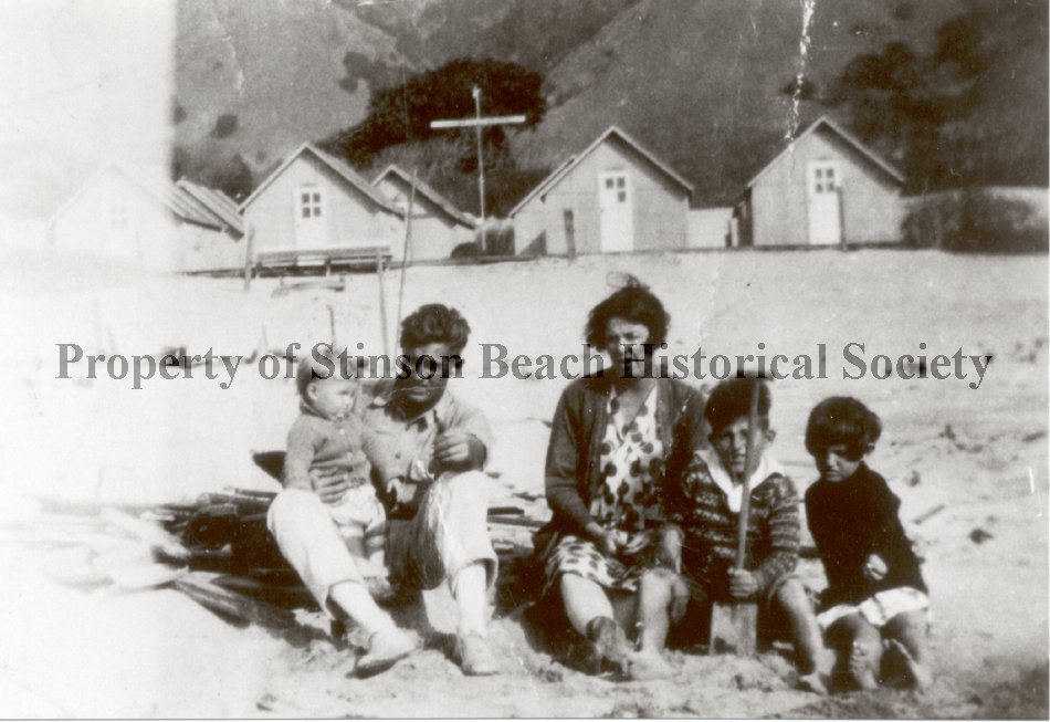 Family of 5 sits on the beach. L. to R. a fair-haired child, Billie, sits on his father's (Earl) knee; a dark-haired and very tan-looking Earl; wife Dorothy Foster Thomson in dotted dress and long cardigan and short, bobbed hair; son Dave in striped sweater and shorts holding a shovel upright in the sand; and cousin Marna in dark sweater, short white skirt and bare feet. Beyond them is a row of identical houses with A-frame roofs and single white door with 4 small windows centered in the upper part of the door.