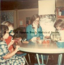 Polaroid of Montessori Preschool teacher Leah Ward wearing glasses and braids and a turquoise shirt sitting at a round table with 4 children. They appear to be working on a crafts project.