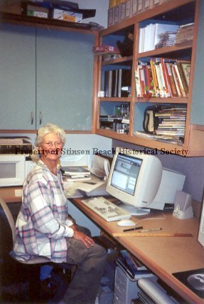An original color photograph of Barbara Ward who is one of the SBHS digitizers. She sits in front of SBHS computer placed at the back room of the Stinson Beach Library back room. She is facing toward the camera smiling. She is wearing a multi pastel-colored checkered shirt. The computer screen, shelves above, and cabinet doors behind her are visible.