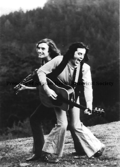 Chris (front) and Lorin Rowan with their guitars acting out on Mt Tamalpais. Chris bends over his guitar, knock-kneed in bell-bottomed pants and open-mouthed in song, while Lorin sneaks an impish peek over Chris's shoulder. Wooded hillside forms a backdrop.