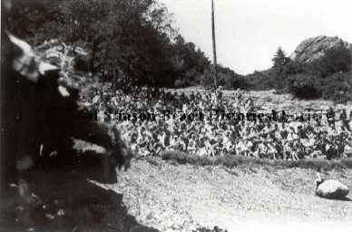 Large group of people sitting on the mountainside - possibly watching a play at the Mountain Theater on Mt. Tamalpais.