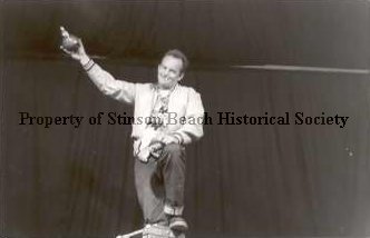 Melodrama presented at the Stinson Beach Community Center. Photo shows a man standing in front of a dark curtain. He has on jeans, a windbreaker, paisley shirt and is resting one arm on his leg, which is resting on a wooden object, and holding a spotlight cover in his hand. In the other hand he holds a spotlight bulb. That arm is upraised over his head and he has a cigarette dangling from his lips. He is smiling. Appears to be doing a comedy routine.