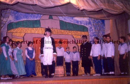 This color photograph is of a stage and a cast of boys and girls. The backdrop is very colorful with blue sky and a green, gold and beige painted ship cabin with red doors and rigging rope-ladders rising up at the sides. A boy in an admirals costume is standing center stage. Lined up behind him to the right are 8-10 boys dressed as sailors and one dressed as a captain. Lined up behind him to the left 5 girls are visible. They are wearing short sleeved, long dresses with white long sleeved turtlenecks underneath. The dresses are shades of blue and aqua. Above the cast can be seen two more curtains or backdrops rolled up and suspended from the ceiling.