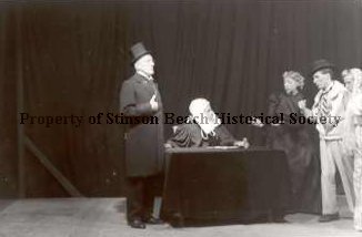 B&W photo shows a judge in long white wig and black robe seated at a table looking at a group of three people (one man stands between 2 women) who appear to be explaining their case. The woman on the left, dressed in a long black dress has her arm out to him in supplication; the man has his had clenched in front of him; and the other female is demure with her head slightly downcast. She is wearing white and has a lacy scarf over her head. The villain stands to the left of the judge, with his right hand over his heart inside his waistcoat. He's dressed in a long black coat and top hat and wears spectacles with a self-righteous look on his face.