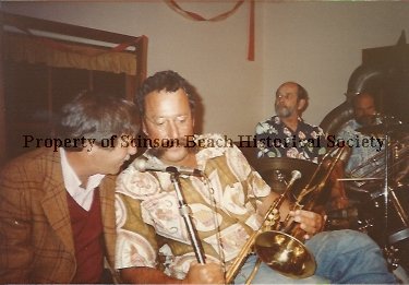 Ben listens to Kendrick has both take a break from playing. Ben holds his horn in one hand and (a mic) in the other. The musician in the back in the flowered shirt is unidentified.