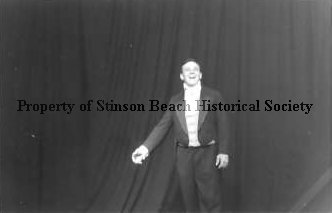 Black and white photograph shows a man dressed in a tuxedo with high-neck shirt, cravat and vest who appears to be singing. He stands in front of a dark curtain with one arm at his side and the other slightly stretched out away from his body. He is part of a melodrama presented at the Stinson Beach Community Center (Hwy 1 at Belvedere). No date is noted.