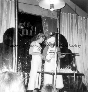 In this black and white picture two men are on the stage. The man on the right wears a chef's hat, a tank top and an ankle length apron wrapped around his waist. He is cooking or pretending to cook something. His tank top has printing on it. The top word is BURGER. The bottom word is partially obscured. The letters that are visible are BONGA (possible Bongalo?). The man on the left appears to be the assistant. He wears the tank top and long apron but no chef's hat. The writing on his tank top is unreadable in this photo. Two backs of heads of audience members are visible at the bottom of the picture.