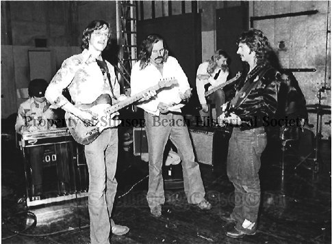 George Frayne aka Commander Cody stands with a couple of band mates in some sort of makeshift studio. (Over the Hill Bar and Grill?) and Amps and drumset and electric keyboard are assembled behind them as well as 3 other musicians sitting or standing casually. George is reading off a paper while the guitarist on right is listening and the one on the left is eyeing the camera.
