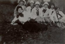 This black and white photograph is of seven young women. They are seated on a leafy/grassy hillside. There is a young woman reclining on her right elbow in front. Behind her going from left to right are four girls wearing hats with narrow brims and next to them are two hatless girls. The woman in front has on a long black skirt and appears to be older than the others who are wearing shorter, lighter skirts. They are all wearing middy blouses and black ties.