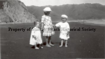 This black and white original photographic print shows three children standing on the beach at Bolinas. The oldest child, a girl, is wearing a plaid dress and a white hat. She is standing in the middle holding the hands of two boys (her brothers?) on each side. The boy on the left is a toddler and is wearing a dress. The boy on the right is older. He is wearing a smock dress with short pants visible underneath and a sailor cap. The ridge above the lagoon is visible in the background as is the ocean and the water entrance to the lagoon.