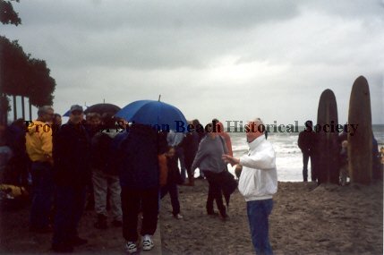 A group of mourners walk toward the surf, some holding umbrellas. The sky is gray and overcast. A few surfboards can be seen on the right standing upright in the sand with people beside them. One white-haired man in a white sweatshirt in the center of the photo has his arm outstretched as if in greeting or to motion the group forward.