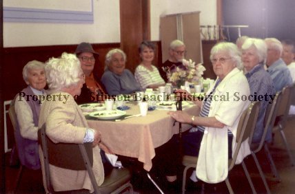 A color photograph of the White Cap Senior Lunch at the community center board room in 2001. Present are from the center front clock wise: Sadler, Mildred/Goodman,Betty/Sullivan, Nancy/Crandall,Harriet/Crandall, Ron/De Beers, Jack/De Beers, Jan/Bewley, Virginia
