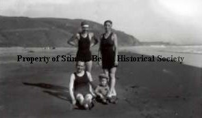 Two women stand behind a sitting man and boy child on Stinson Beach. The adults are wearing black one-piece bathing suits of the day on Stinson Beach. The child is in coveralls and cap. The view is south towards the "rocks" at the end of the beach an the surf is visible on the right.
