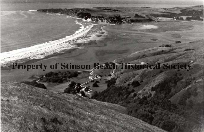 This is a black and white photograph taken from high on a steep hill. It looks down on a gully with some buildings and roads winding up the hillside and, beyond, a sandspit dividing a lagoon on one side and the ocean, with breakers, on the other. Beyond the sandspit a peninsula juts out into the ocean. It is a view of Bolinas Bay, Bolinas Lagoon, the undeveloped sandspit and Stinson Ranch in Stinson Gulch.