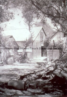 This black and white photo is centered on a barn with an open door. To the left and right of the barn are other buildings. The building on the right has a small shed against its side with a chimney pipe coming out of its roof and a ladder leaning against its side. There is a shaded area in the foreground with tree branches above what appears to be a dump site with pieces of lumber, a ladder and a cylinder of some sort lying on the ground.