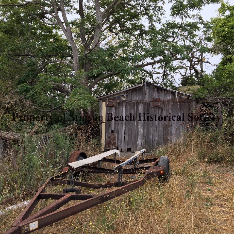 This is a digital photo of the old work shed on the old Stinson Ranch. There is an old rusted boat trailer parked in front of it. It has weathered vertical board sidings and barn doors with a large floodlight type fixture above. It has about 14 feet wide facade.The roof is corrugated sheet metal now half rusted. the right side of the building has a wooden frame holding several pipes likely built by current occupier, SBCWD. Though the photograph does not show it, the back side of this building holds an old abandoned green Jeep with its bed filled with a giant nest of woodrats. A rusted boat trailer is parked in front of the barn doors.