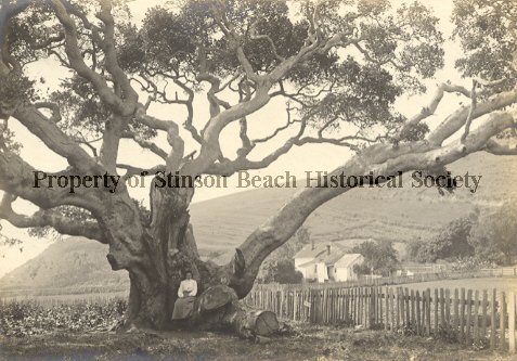 An original black and white photographic print by Edgar A. Cohen. It shows a large oak tree in foreground with Cohen's wife, Jane, sitting on the lower trunk which is cut off. Grape stake fence and the ranch building in back of the tree and hill and sky beyond. On its back : Photograph (stamped) #1814 - Large Oak on Stinson Ranch (penciled) Edgar A. Cohen, Alameda, Cal. (stamped)