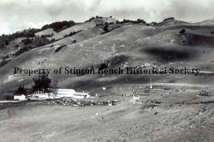 A black and white photograph of the White Gate Ranch barn as it sat on the hill with many cows surrounding. The barn and adjoining buildings are in white and eucalyptus trees and cypresses are behind and in front. Fences divide the hillside corralling the cows. Panoramic Highway sweeps in from the right and the white gate can be seen. Hills above the town of Stinson Beach are behind the barn.