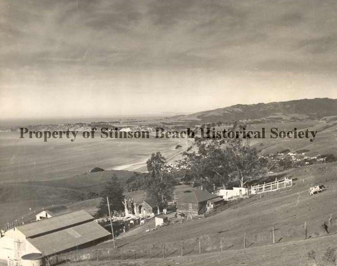 This black and white original photograph shows White Gate Ranch in the foreground and Bolinas Bay in the background. There is a barn in the left hand corner and behind it can be seen the roof of another barn. There are smaller buildings to the right of the upper barn. The ranch is set on a hill overlooking Bolinas Bay and the town of Stinson Beach, some houses of which can be seen at the far right center of the photograph.