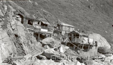 Looking up at "Gypsy Camp" from lower on the beach. It shows that the shacks are built on stilts above the boulders and rocks.
