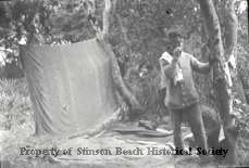 A young man in sweater and long pants with a white towel draped over his shoulder stands by a tree in a campsite in the woods. He has one hand on the trunk of the tree and is holding to his mouth in his other either a toothbrush or a cigarette. To the side of him, a blanket hangs to the ground over a line strung between the trees. There are other blankets spread on the ground.